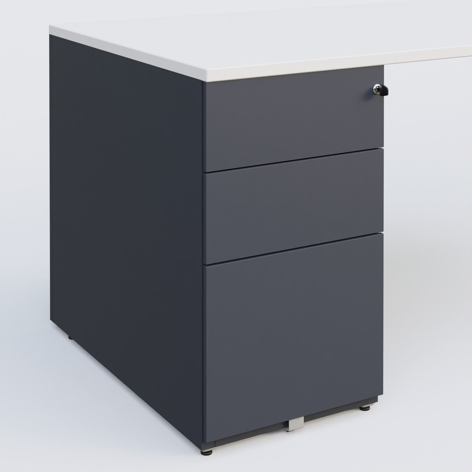 Plan droit mélamine en 25 mm avec caisson métal 3 tiroirs porteur sous plateau à gauche qui remplace un pied.