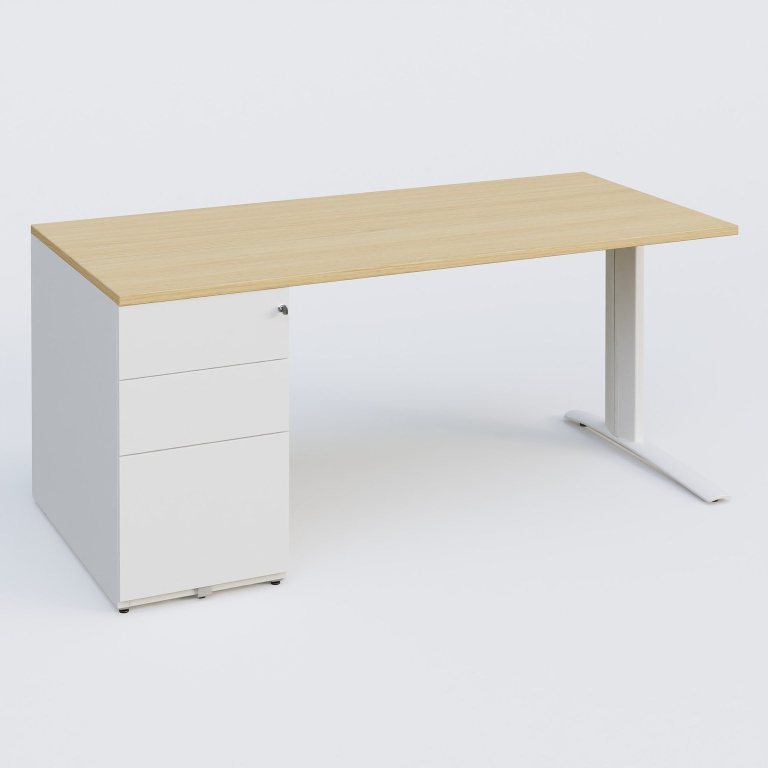 K1 Plateau droit 180x80 avec caisson métal porteur sous plateau à gauche. Plateau Chêne clair et pietement Blanc