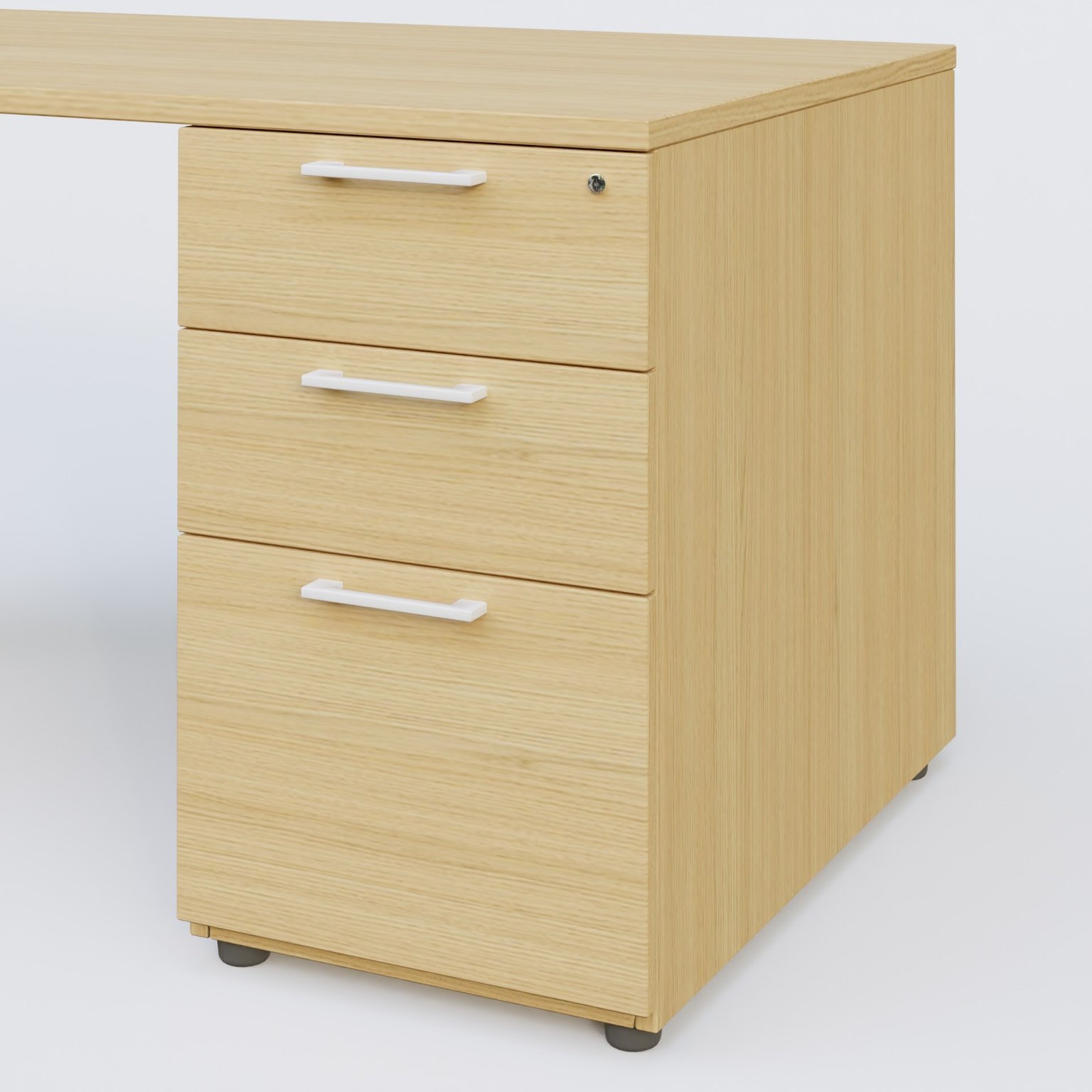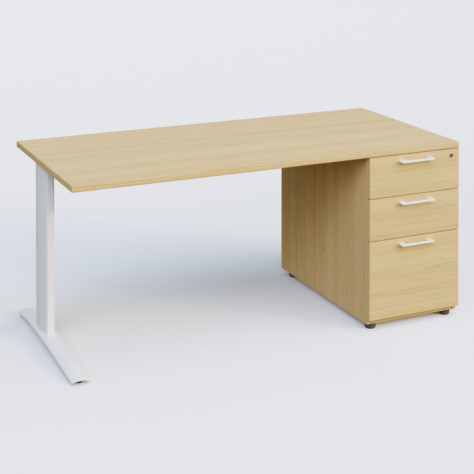 K1 Plateau droit 180x80 avec caisson porteur sous plateau mélamine à droite. Plateau Chêne clair et pietement Blanc