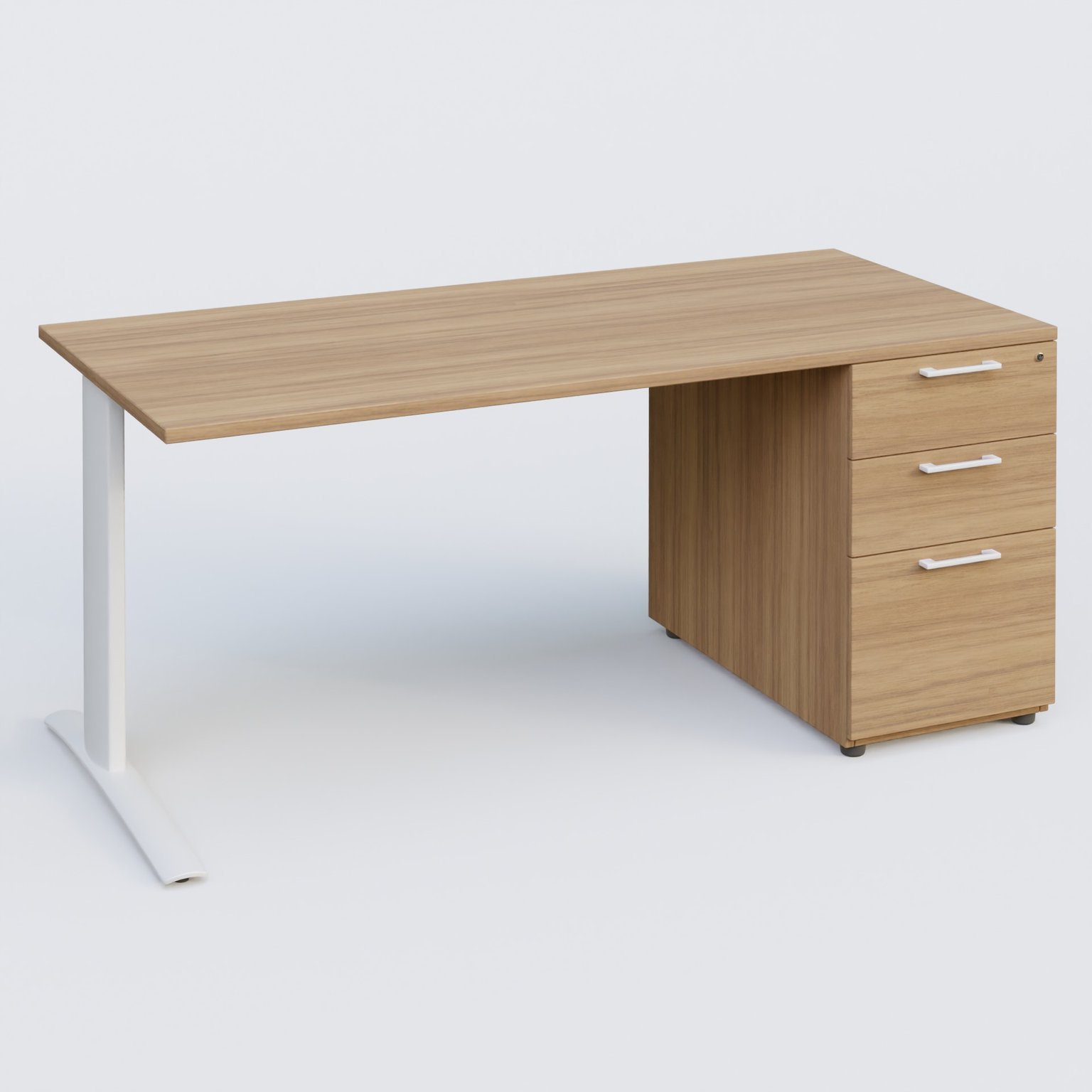 Plan droit mélamine en 25 mm avec caisson 3 tiroirs porteur sous plateau mélamine à droite qui remplace un pied.