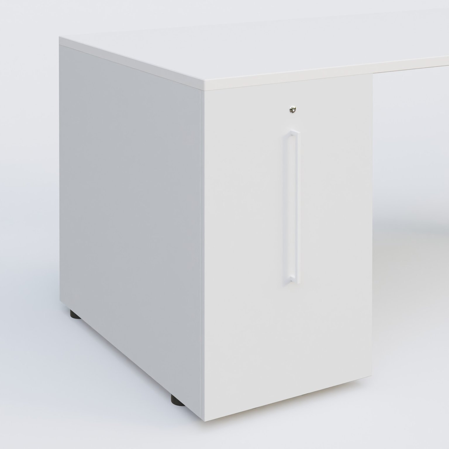 Plan droit mélamine en 25 mm avec tour de rangement blanche sous plateau à gauche qui remplace un pied.
