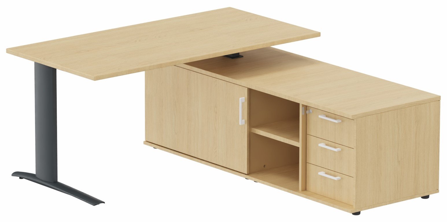 k1 Poutre - Plan 160x80 avec meuble porteur (L180xP64) avec caisson 3T intégré - meuble à droite -Finitions = Plateau et top de finition : Chêne (CE) /Piétement :anthracite /Façade : Chêne (CE)