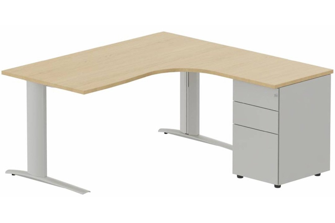 k1 Poutre - Plan compact 90° asymétrique 180x162x80 / 60cm avec caisson HB métal 3 tiroirs - retour à droite -Finitions : PLATEAUX: CHENE (CE) / PIETEMENTS: ALUMINIUM (AL) / CAISSONS METALLIQUES: ALUMINIUM (AL)