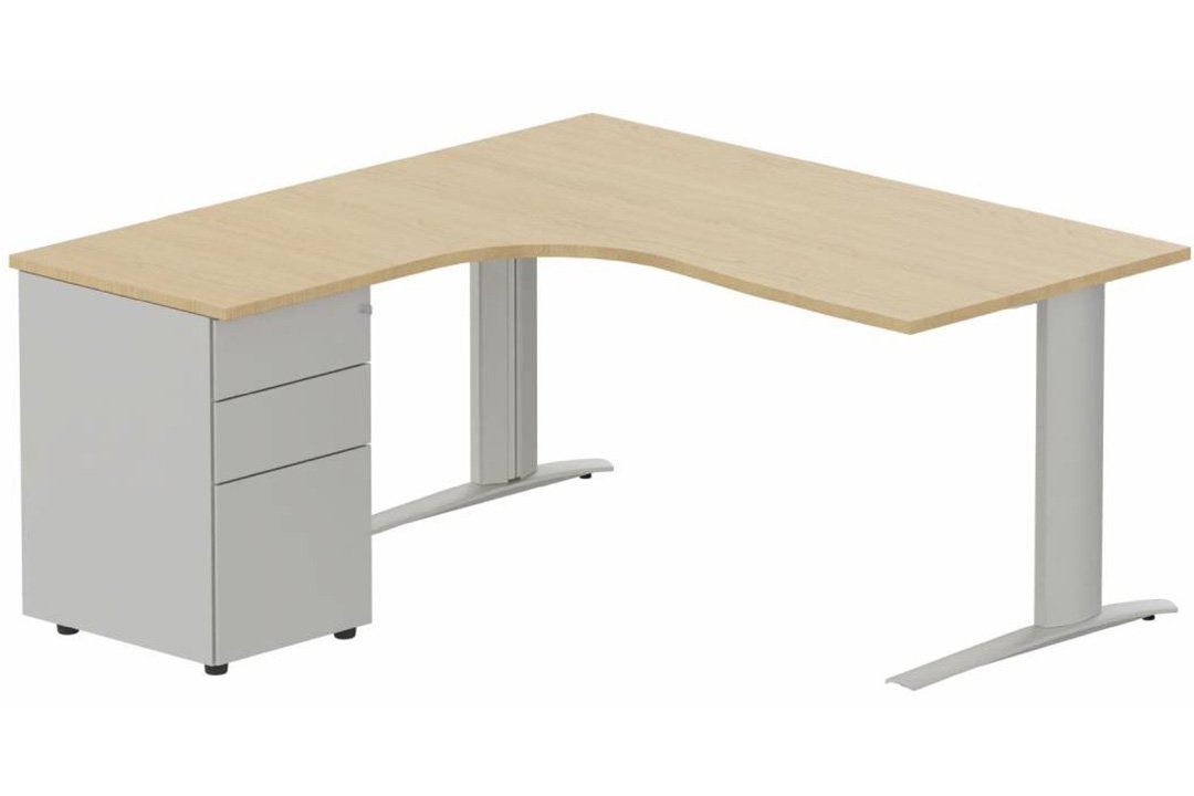 k1 Poutre - Plan compact 90° asymétrique 180x162x80 / 60cm avec caisson HB métal 3 tiroirs - retour à gauche -Finitions : PLATEAUX: CHENE (CE) / PIETEMENTS: ALUMINIUM (AL) / CAISSONS METALLIQUES: ALUMINIUM (AL)