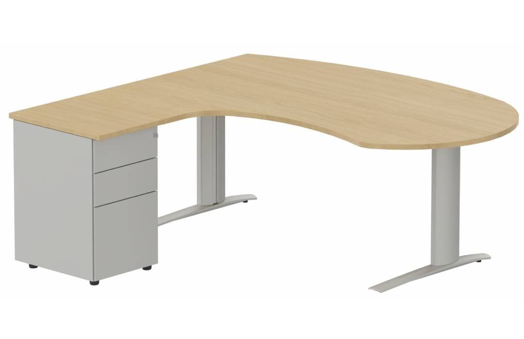 k1 Poutre - Plan compact 90° asymétrique Manager 190x183x104 / 60cm avec caisson HB métal 3 tiroirs - retour à gauche -Finitions : PLATEAUX: CHENE (CE) / PIETEMENTS: ALUMINIUM (AL) / CAISSONS METALLIQUES: ALUMINIUM (AL)