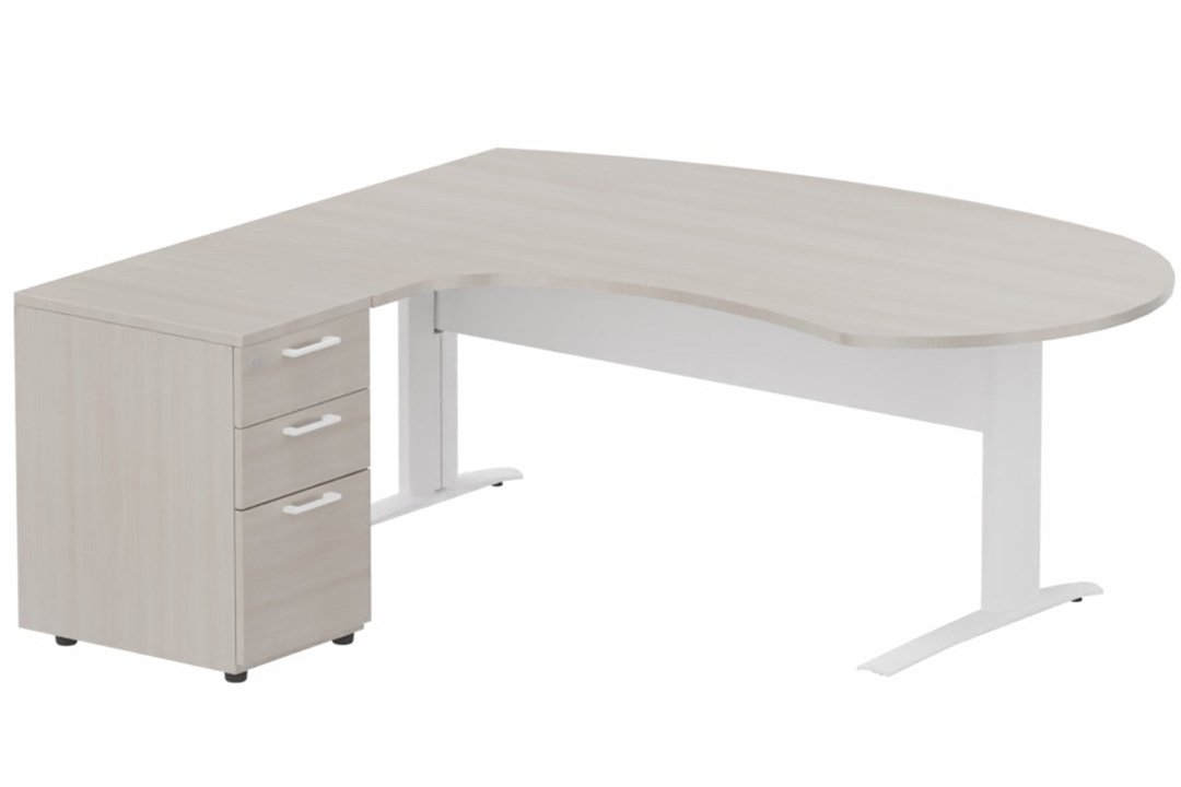 K1 VDF métal compact 90° manager 190x141x104x60cm sur caisson HB mélamine 3 tiroirs, plateau acacia, structure blanc