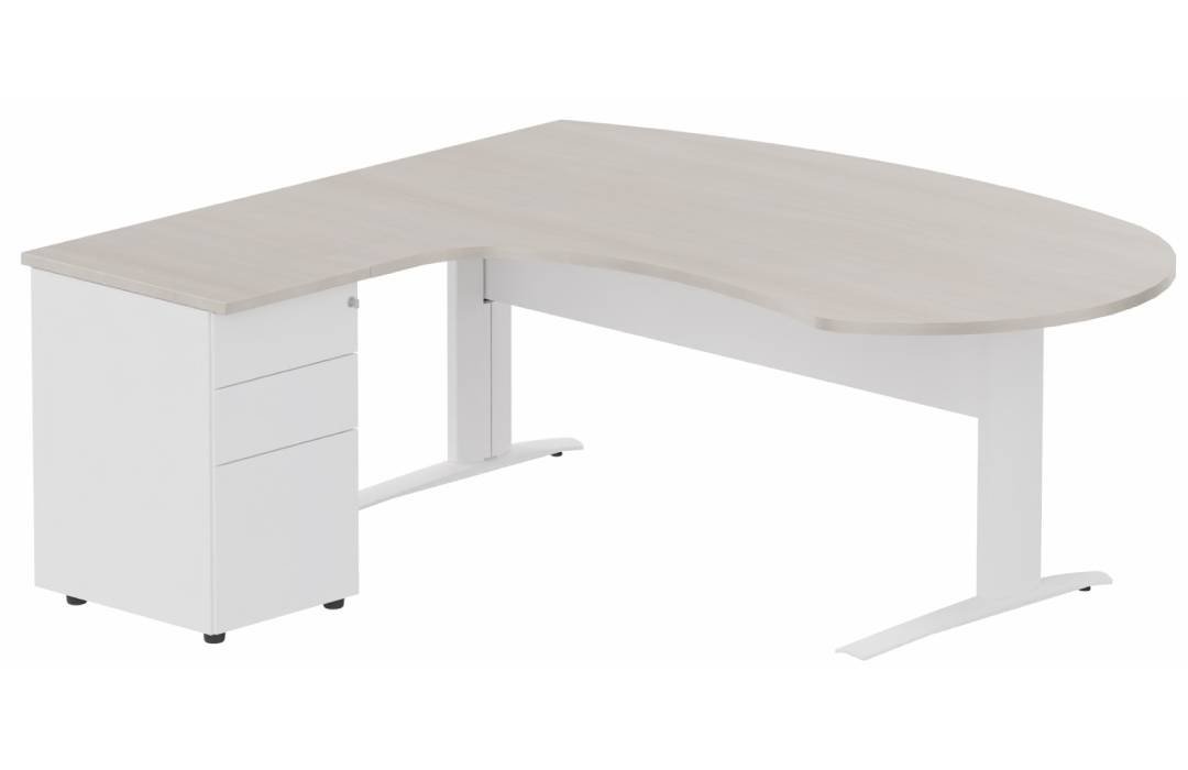 K1 VDF métal compact 90° manager 190x141x104x60cm sur caisson HB métal 3 tiroirs, plateau acacia, structure blanc