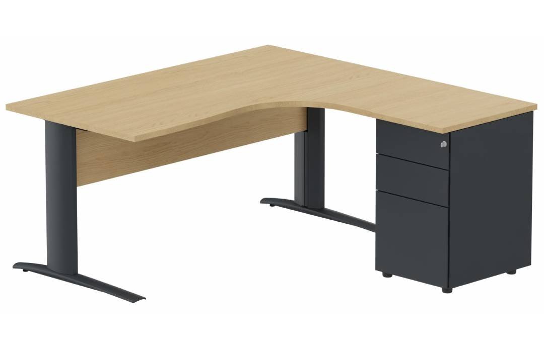 K1 Voile de fond Bois- Plan compact 90° asymétrique 160x162x80/60cm avec caisson HB métal 3 tiroirs - retour à droite -Finitions : PLATEAUX: CHENE (CE) / PIETEMENTS: ANTHRACITE (AN) / CAISSONS METALLIQUES: ANTHRACITE (AN)