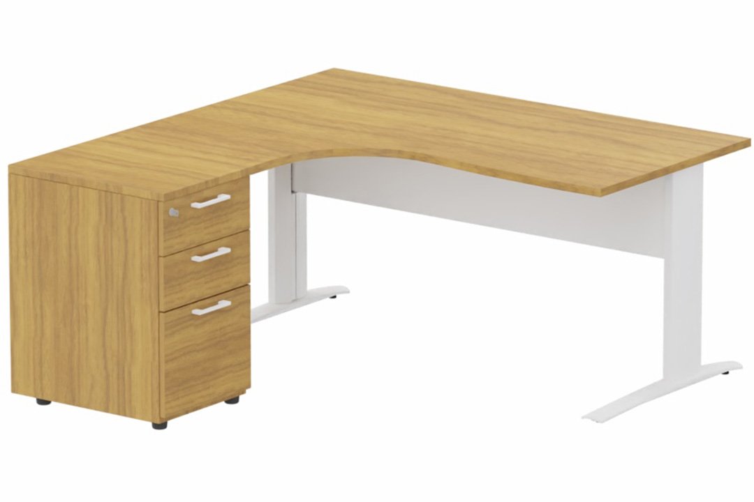 K1 Voile de fond Métal - Plan compact 90° asymétrique 160x162x80/60cm avec caisson HB bois 3 tiroirs - retour à gauche -Finitions : PLATEAUX: NOYER (NO) / PIETEMENTS: BLANC (BL) / CAISSONS MELAMINE: NOYER (NO)