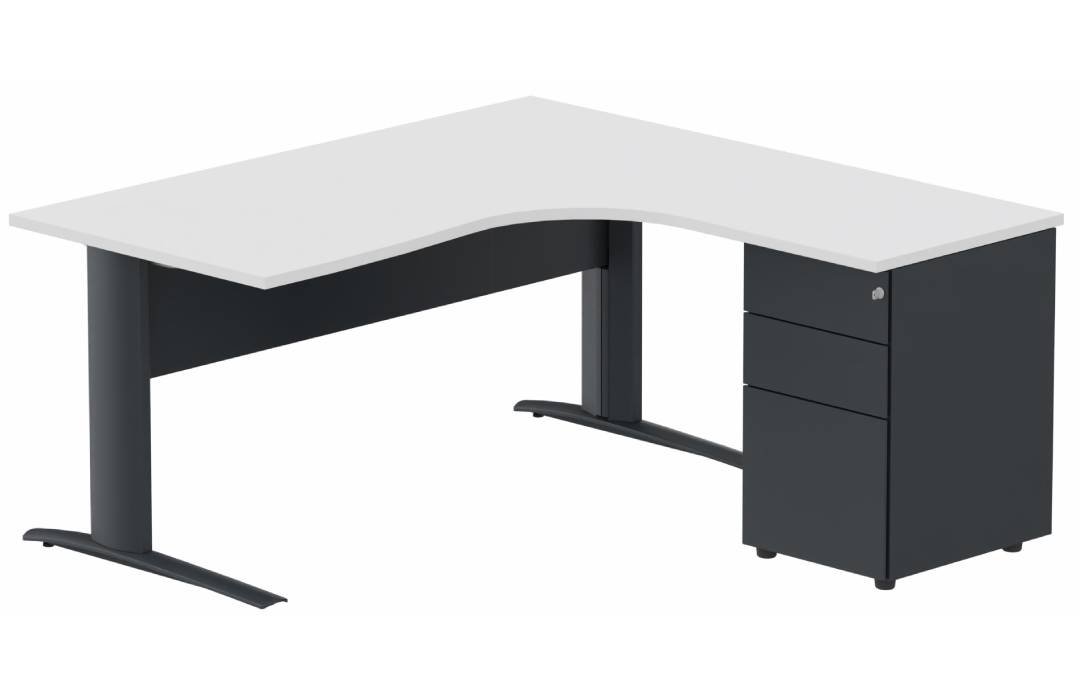K1 Voile de fond Métal - Plan compact 90° asymétrique 160x162x80/60cm avec caisson HB métal 3 tiroirs - retour à droite -Finitions : PLATEAUX: BLANC (BL) / PIETEMENTS: ANTHRACITE (AN) / CAISSONS METALLIQUES: ANTHRACITE (AN)