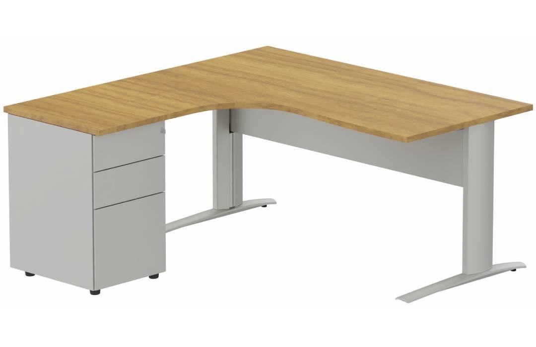 K1 Voile de fond Métal - Plan compact 90° asymétrique 160x162x80/60cm avec caisson HB métal 3 tiroirs - retour à gauche -Finitions : PLATEAUX: NOYER (NO) / PIETEMENTS: ALUMINIUM (AL) / CAISSONS METALLIQUES: ALUMINIUM (AL)