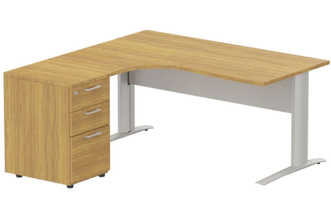 K1 Voile de fond Métal - Plan compact 90° asymétrique 180x162x80/60cm avec caisson HB bois 3 tiroirs - retour à gauche -Finitions : PLATEAUX: NOYER (NO) / PIETEMENTS: ALUMINIUM (AL) / CAISSONS MELAMINE: NOYER (NO)