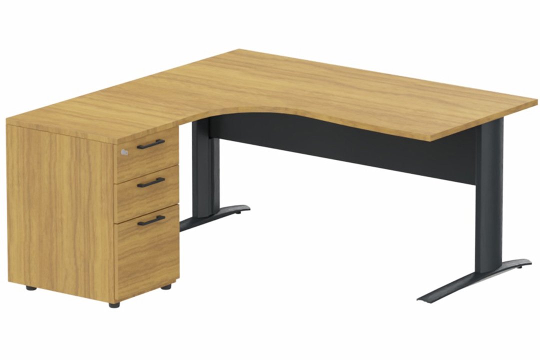 K1 Voile de fond Métal - Plan compact 90° asymétrique 180x162x80/60cm avec caisson HB bois 3 tiroirs - retour à gauche -Finitions : PLATEAUX: NOYER (NO) / PIETEMENTS: ANTHRACITE (AN) / CAISSONS MELAMINE: NOYER (NO)