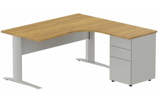 K1 Voile de fond Métal - Plan compact 90° asymétrique 180x162x80/60cm avec caisson HB métal 3 tiroirs - retour à droite -Finitions : PLATEAUX: NOYER (NO) / PIETEMENTS: ALUMINIUM (AL) / CAISSONS METALLIQUES: ALUMINIUM (AL)