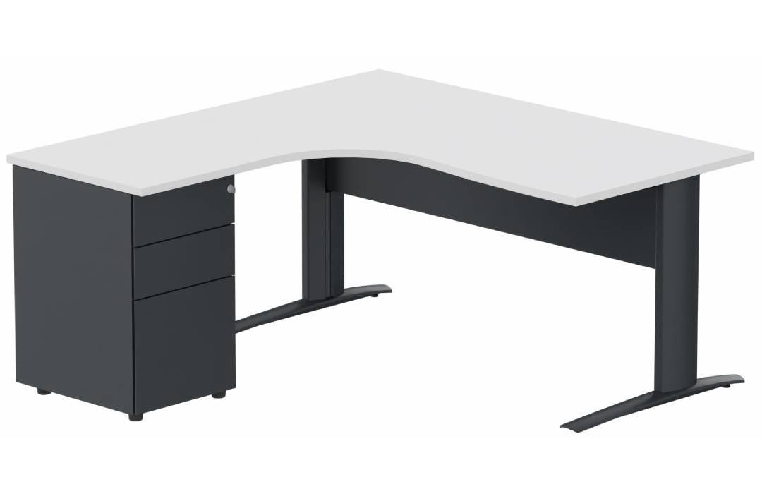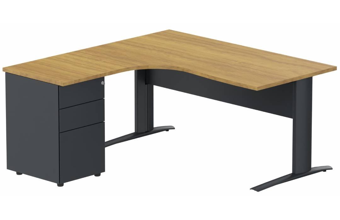 K1 Voile de fond Métal - Plan compact 90° asymétrique 180x162x80/60cm avec caisson HB métal 3 tiroirs - retour à gauche -Finitions : PLATEAUX: NOYER (NO) / PIETEMENTS: ANTHRACITE (AN) / CAISSONS METALLIQUES: ANTHRACITE (AN)