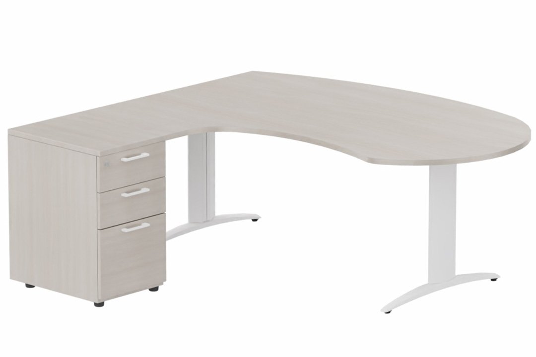 K2 compact 90° manager 190x141x104x60cm sur caisson HB mélamine 3 tiroirs, plateau acacia, structure blanc