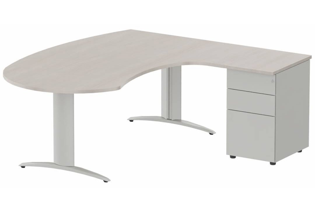 K2 compact 90° manager 190x141x104x60cm sur caisson HB métal 3 tiroirs, plateau acacia, structure aluminium