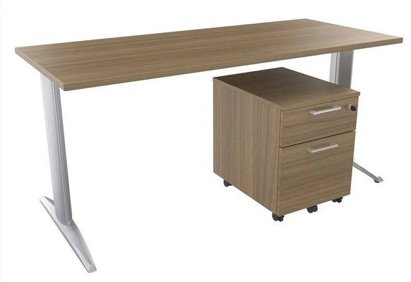K2 plan droit 160x70cm, plateau noyer ambré, structure aluminium + Caisson Mobile 2 Tiroirs Bois