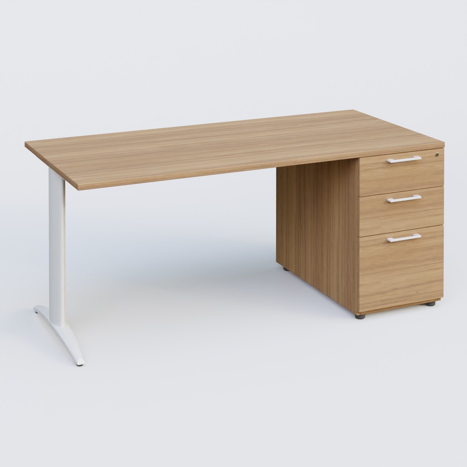 K2 Plateau droit 180x80 avec caisson porteur mélamine sous le plateau. Plateau , caisson Noyer et pietement Blanc