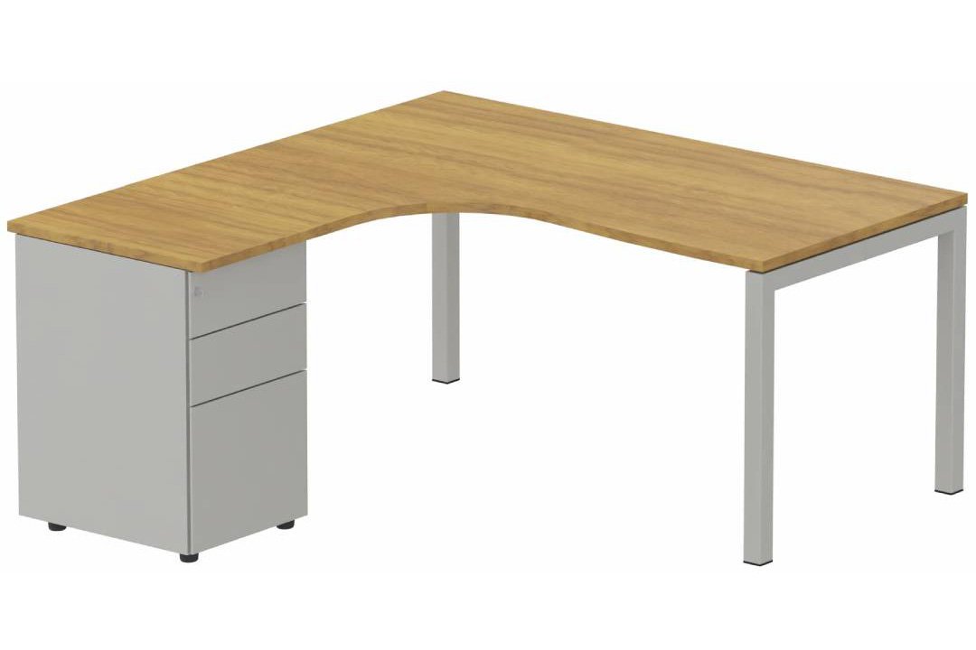 K3- Plan compact 90° asymétrique 180x162x80/60cm avec caisson HB métal 3 tiroirs - retour à gauche Finitions- Plateau et top caisson : Chêne (CE) / Piétements et caisson : Alu cheneCe aluminiumAl