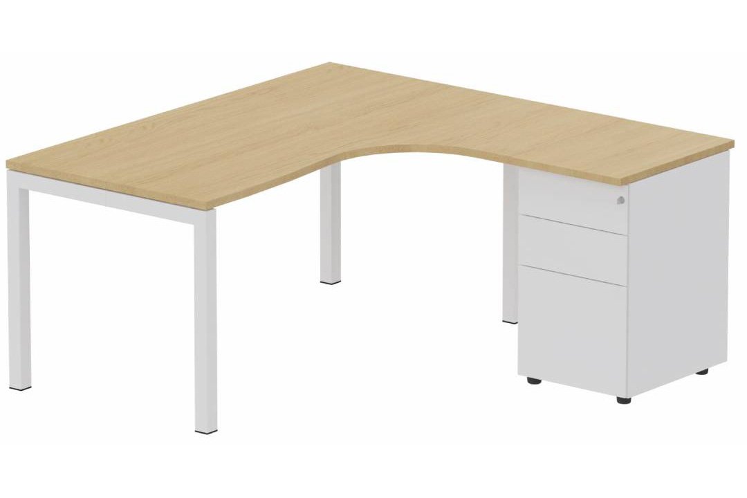 K3- Plan compact 90° asymétrique 180x162x80/60cm avec caisson HB métal 3 tiroirs - retour à droite Finitions- Plateau et top caisson : Chêne (CE) / Piétements et caisson :BLANC (BL)