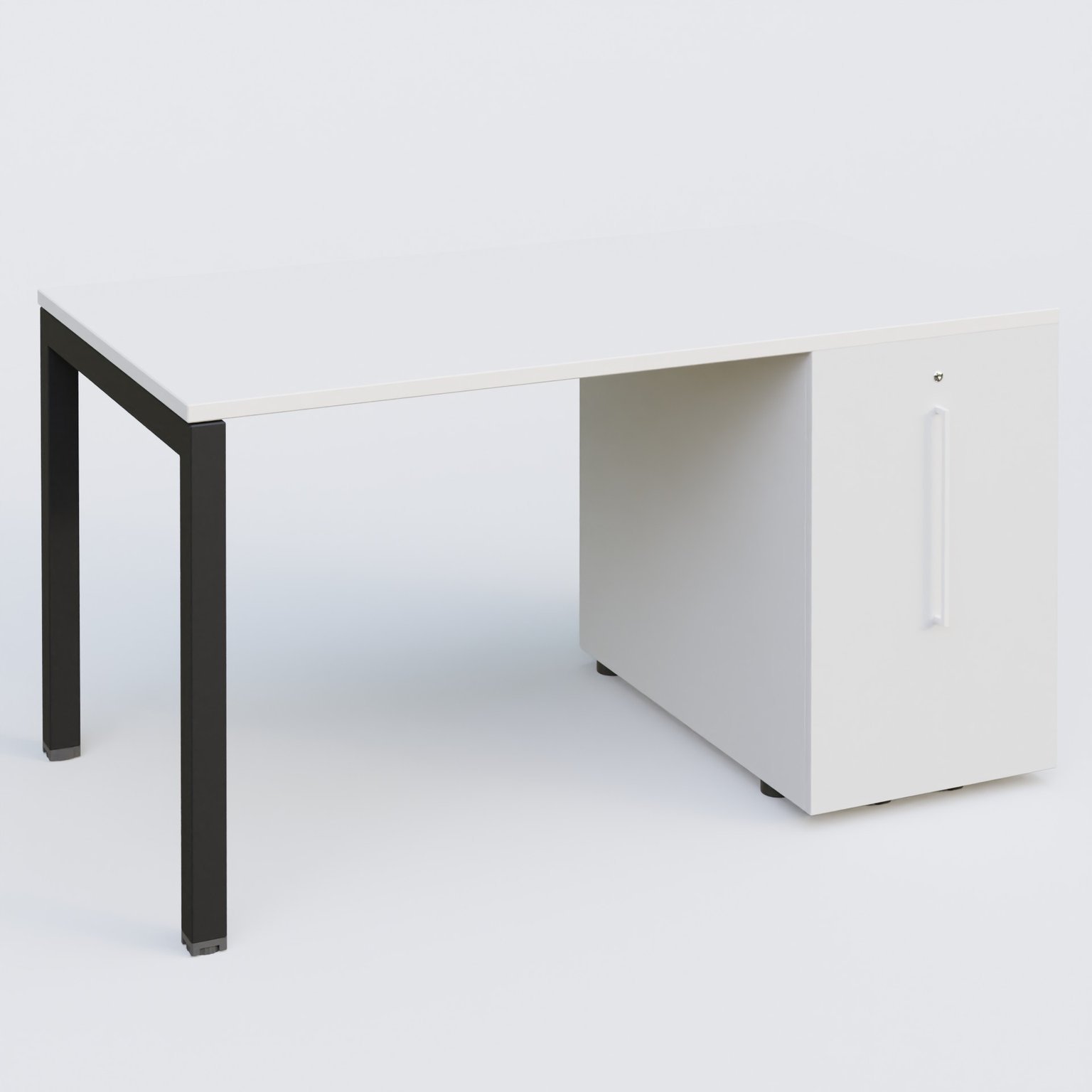 K3 Plateau droit 140x80 avec tour de rangement sous le plateau à droite. Plateau Blanc et pietement Noir Mat