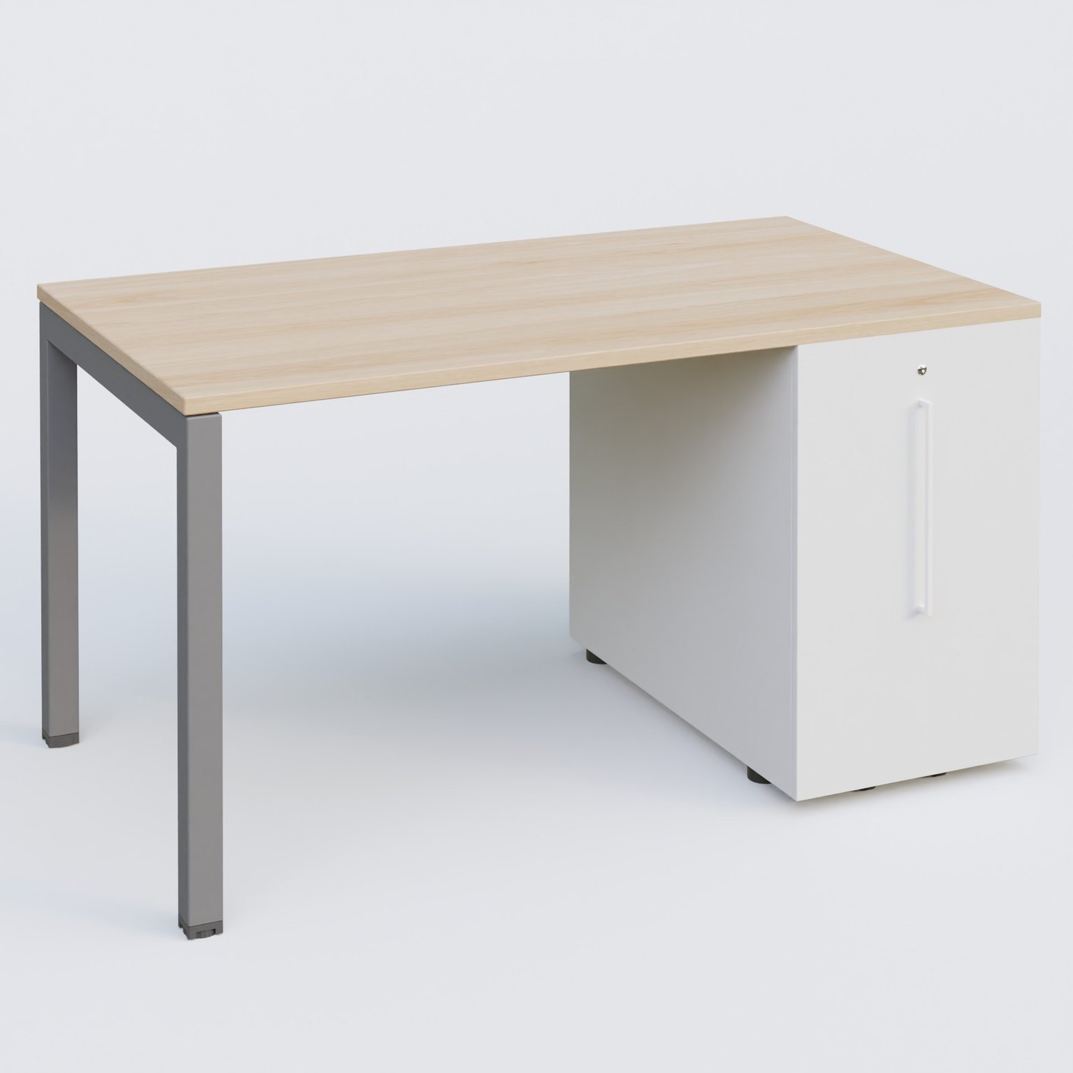 Piétement métallique fixe et plateau de 140 x 80 cm en épaisseur 25 mm.Tour de rangement positionnée à droite en ramplacement du pieds et de couleur blanche.