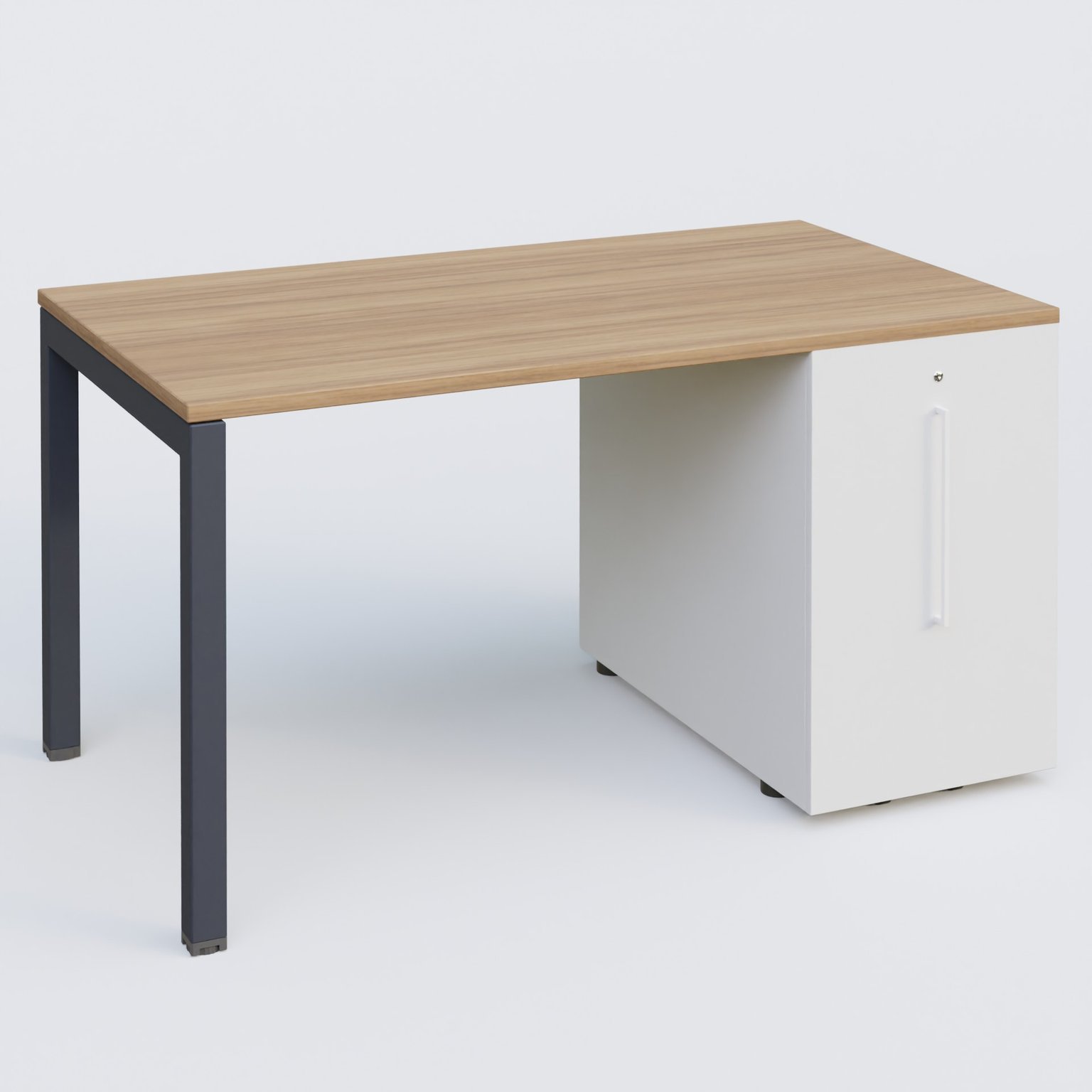 Piétement métallique fixe et plateau de 140 x 80 cm en épaisseur 25 mm.Tour de rangement positionnée à droite en ramplacement du pieds et de couleur blanche.