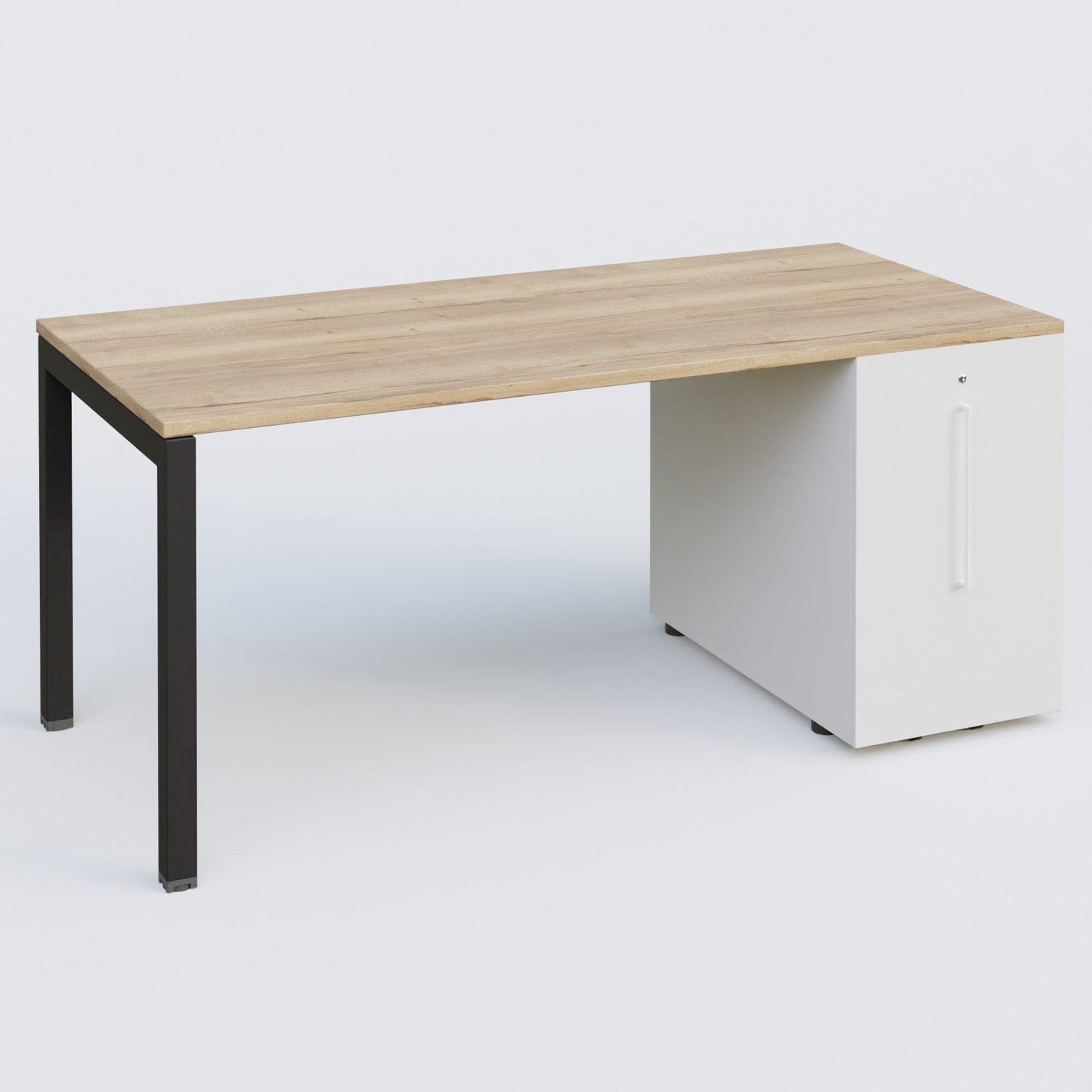 K3 Plateau droit 160x80 avec tour de rangement sous le plateau à droite. Plateau Chêne naturel et pietement Noir Mat