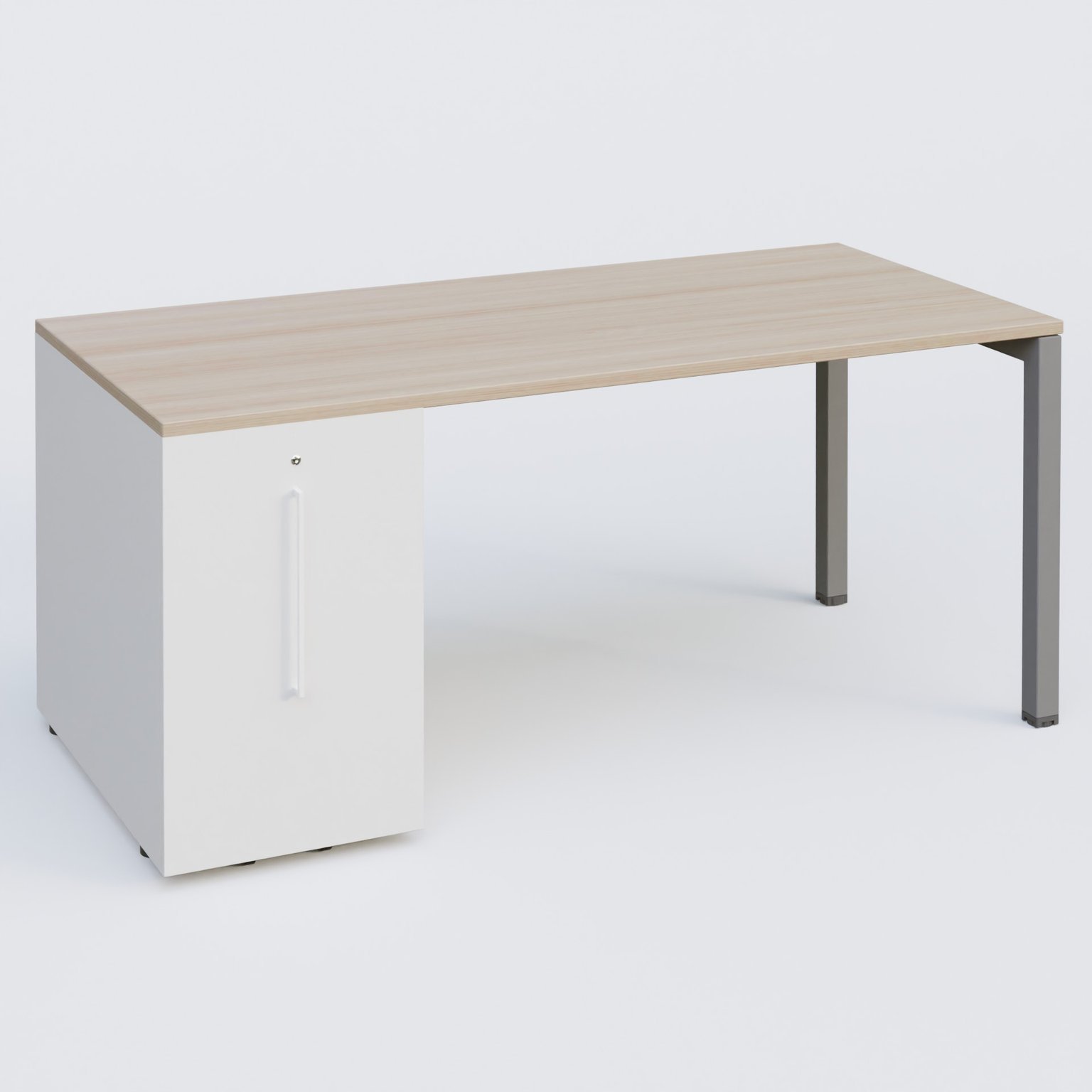 Piétement métallique fixe et plateau de 160 x 80 cm en épaisseur 25 mm.Tour de rangement positionnée à gauche en ramplacement du pieds et de couleur blanche.