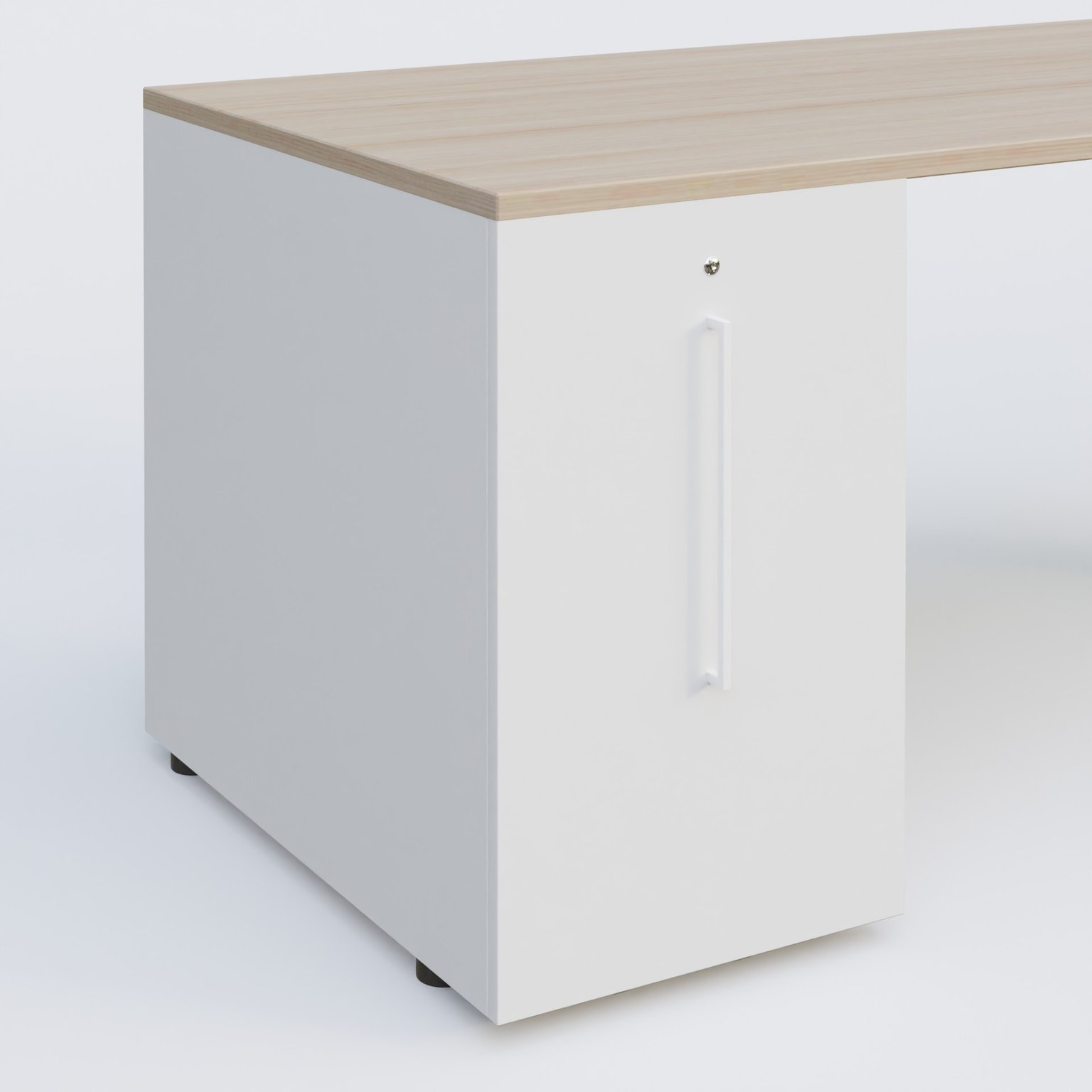 K3 Plateau droit 180x80 avec tour de rangement sous le plateau à gauche. Plateau Acacia et pietement Blanc