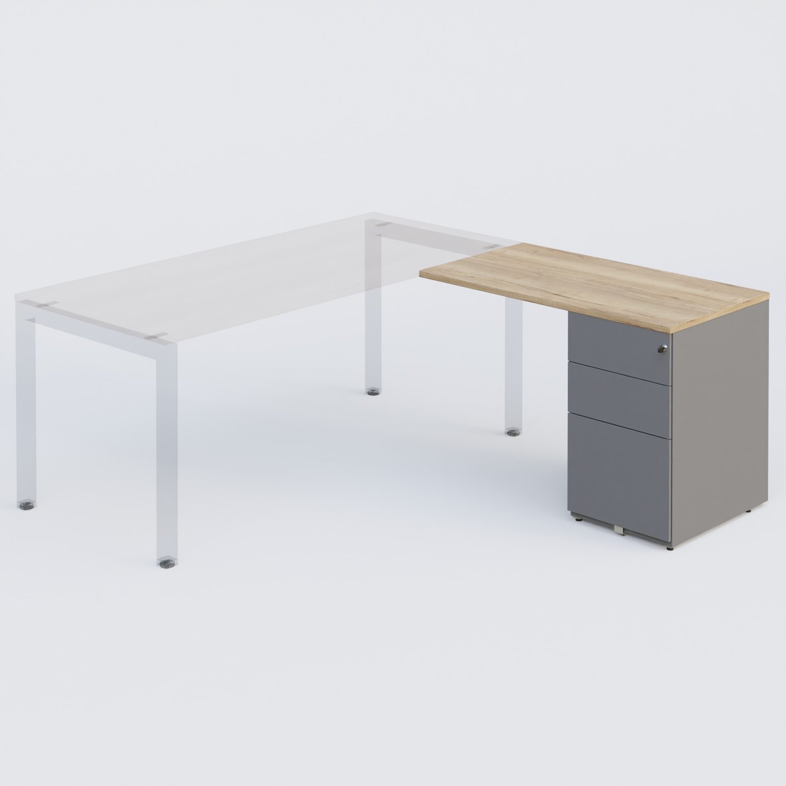 K3 retour direct 120x60cm sur caisson métal HB P.60cm 3 tiroirs. Plateau Chêne naturel et caisson Aluminium