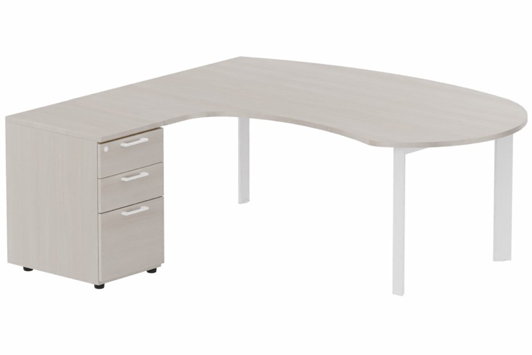 K7 compact 90° manager 190x141x104x60cm sur caisson HB mélamine 3 tiroirs, plateau acacia, structure blanc
