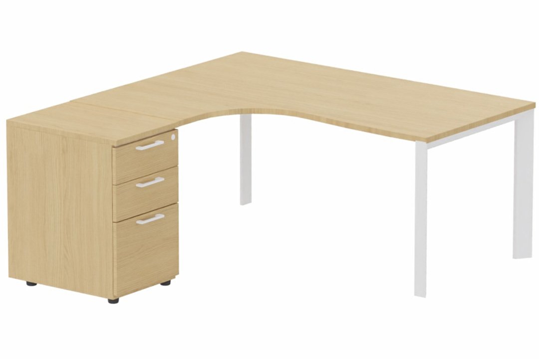 Plan Compact 90° asymétrique 160x162x80/60cm retour à gauche avec caisson HB bois 3 tiroirs, plateau acacia, structure blanc acaciaAk blancBl