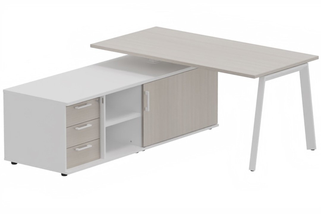 K8 Plan 180x80 avec meuble porteur (L180xP64) avec caisson 3T intégré - meuble à gauche -Finitions = Plateau et top de finition : Acacia / Piétement :Blanc (BL) / Corps du meuble : Blanc /Façade : Acacia