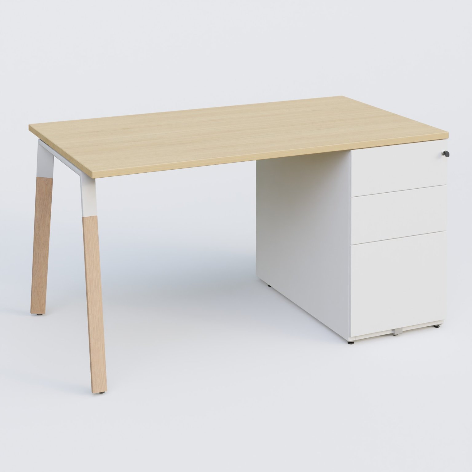 K8 WOOD Plan 140x80 avec caisson porteur en métal. Plateau chêne et caisson blanc.