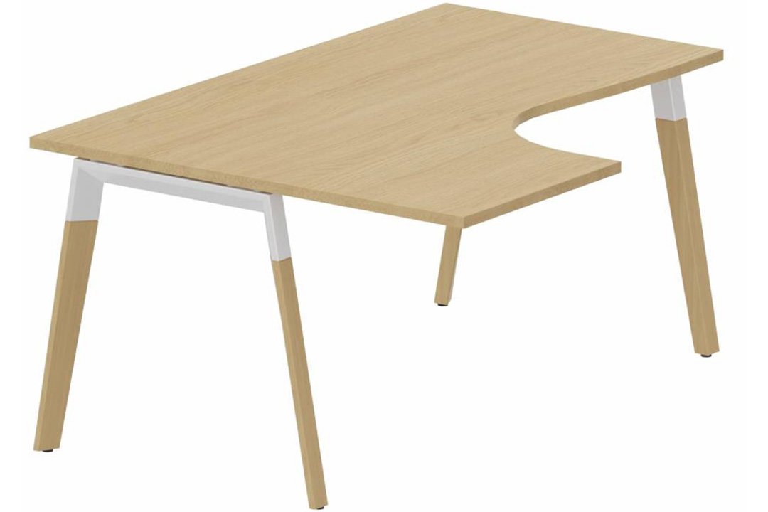 K8Wood Plan compact 90° asymétrique 180x120x80/60cm sur pied de soutien - retour à gauche plateau chêne, piétement blanc / bois