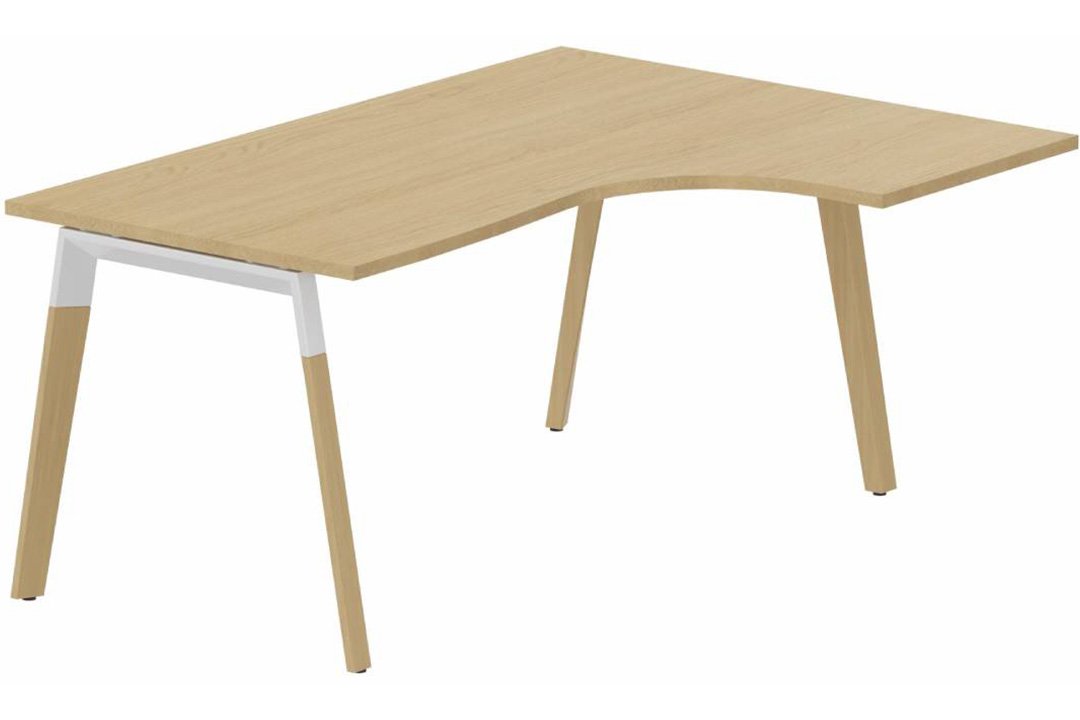 K8Wood Plan compact 90° asymétrique 180x120x80/60cm sur pied de soutien - retour à droite - plateau chêne, piétement blanc / bois