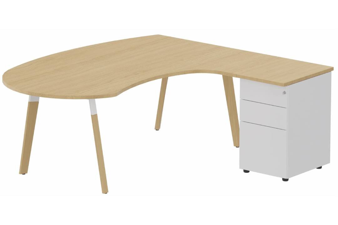 K8Wood Plan compact 90° asymétrique Manager 190x183x104x60cm avec caisson HB métal 3 tiroirs - retour à droite -Finitions = Plateau et top de finition : chêne /Piétements : Blanc / bois (BW) / Caisson: Blanc (BL)