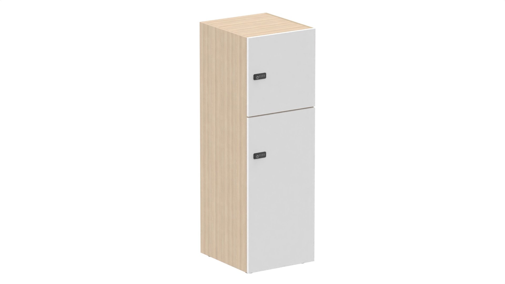2 cases : 1 x H86cm (en bas) + 1 x H43cm. portes pleine. serrure à code. corps coloris blanc (M1). portes mélamine coloris frêne (D3)