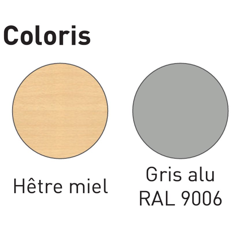 - Panneau mélaminé coloris Hêtre miel et piètement époxy coloris gris alu RAL 9006.