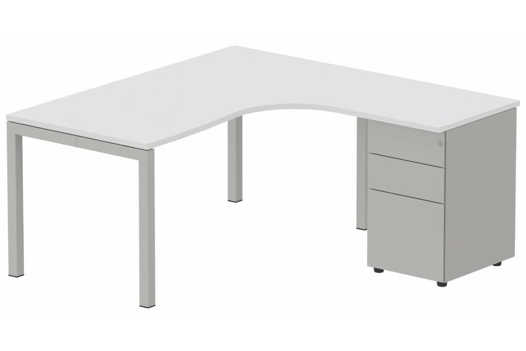 Plan Compact 90° asymétrique 180x162x80/60cm retour à droite avec caisson HB métal 3 tiroirs blanc/aluminium - sur délai