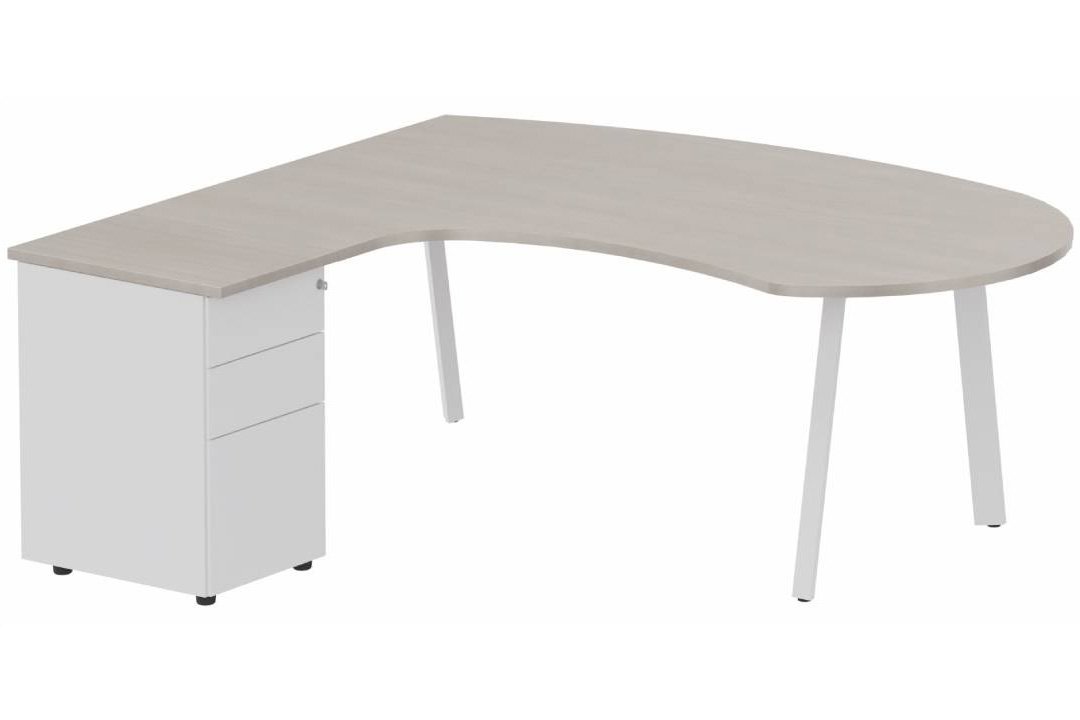 Plan compact 90° manager sur caisson HB métal 190 x 141 x 104 x 60 cm, 3 tiroirs, plateau acacia, structure blanc