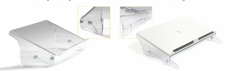 Evite les douleurs dorsales et à la nuque. Réglage sur 7 positions (12°-46°-12-24 cm). Supporte jusqu'à 25 kg. Espace pour clavier de 515 mm. Acrylate transparent. Dimensions : L. x P. x H. : 515 x 120 x 290 mm. Poids: 1.2 kg.