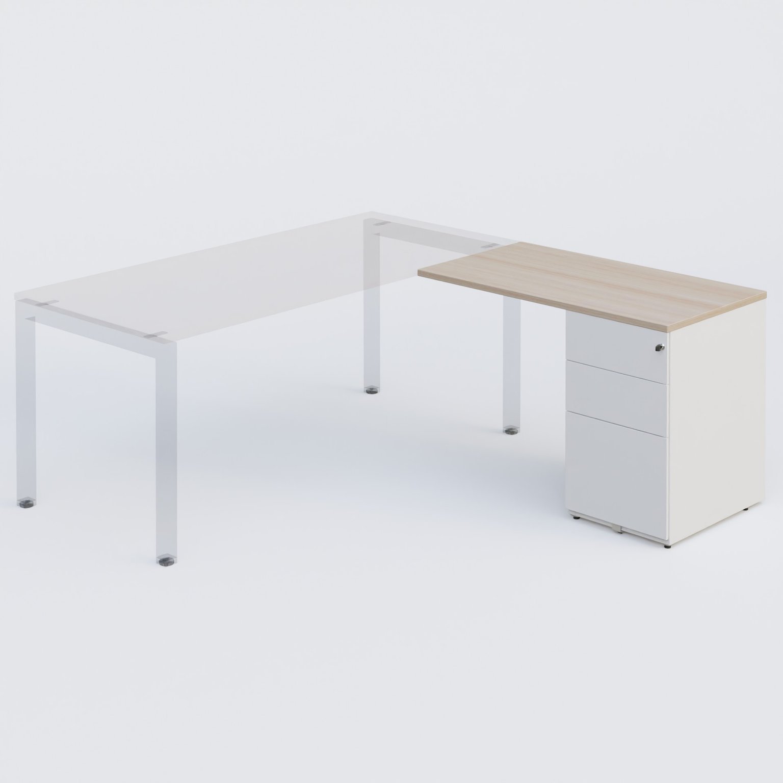 Retour direct 120x60cm sur caisson métal HB P.60cm 3 tiroirs, plateau acacia, structure blanc