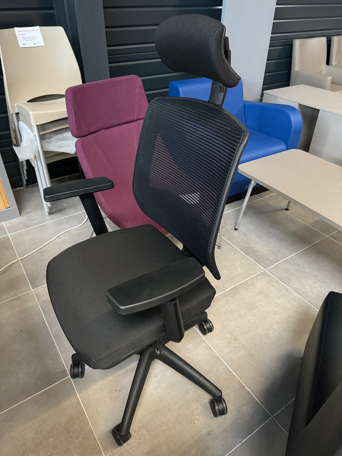 - Siège de bureau avec accotoirs et têtière assise en tissu noir et dossier en résille noir, support lombaire
