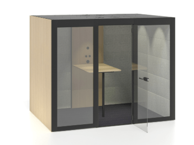 Silent Room L avec parois externes et internes rembourrées en mélamine, paroi centrale interne frontale avec système de commande, portes en verre et plafond en mélamine, coloris Berta