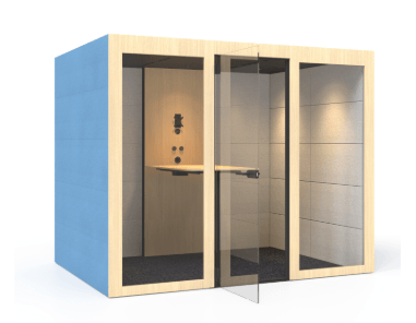 Silent Room L avec parois externes rembourrées et panneau arrière vitré, parois internes rembourrées, paroi centrale interne frontale avec système de commande, portes en verre et plafond en mélamine, coloris Berta