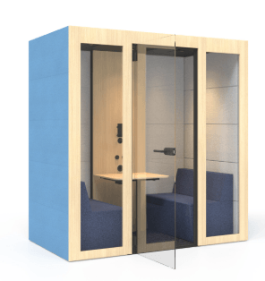 Silent Room M avec parois externes et internes rembourrées, paroi centrale interne frontale avec système de commande, portes en verre et plafond en mélamine, poufs avec dossier (2 pièces), coloris Berta