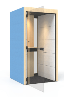 - Silent Room S avec parois externes rembourrées et panneau arrière vitré, parois internes rembourrées, paroi centrale interne frontale avec système de commande, portes en verre et plafond en mélamine coloris berta